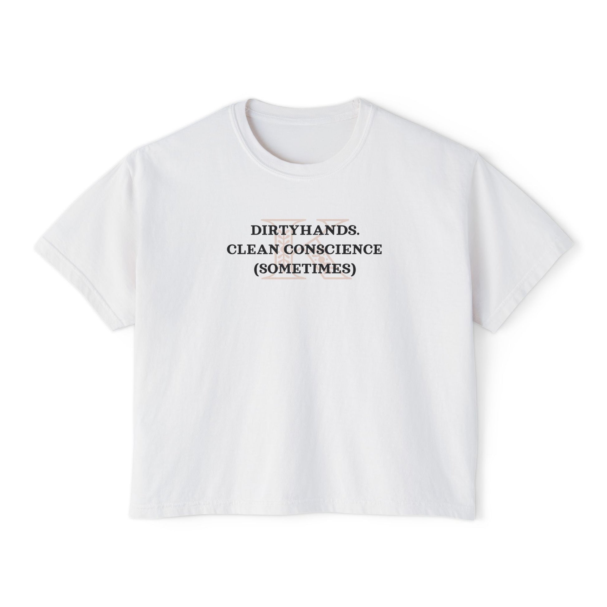 A women's boxy tee featuring the quote 'Dirty Hands Clean Conscience (Sometimes)' along with KAZ BREKKER lines from the Six of Crows Book. Perfect for book lovers and fans of morally gray characters. This tee gives off a cool and edgy vibe, ideal for casual wear or as a statement piece for literary enthusiasts. Relevant for bookworms, fans of Six of Crows, and those who appreciate unique and thought-provoking designs.